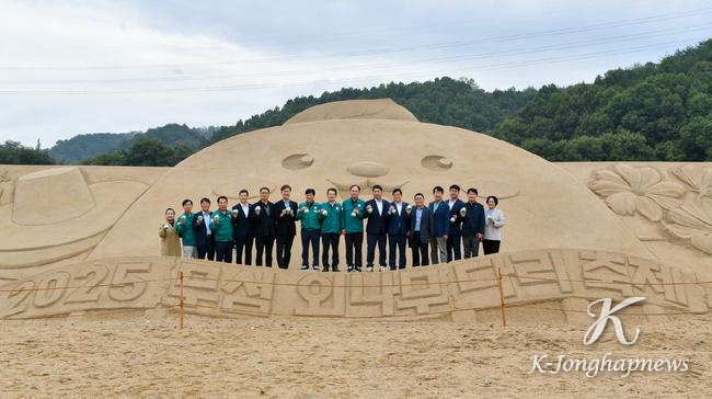 샌드아트 조형물 앞에서 2025영주 무섬외나무다리 축제 개막 기념사진(유정근 영주시장 권한대행, 임종득 국회의원, 김병기 영주시의원) 축제 첫날인 3일, 무섬마을 주무대에서 열린 개막식에는 많은 시민과 관광객이 모여 축제의 시작을 함께 즐겼다. 본 행사에 앞서 외나무다리 퍼포먼스와 전통혼례 재연이 펼쳐져 분위기를 고조시켰고, 이어 캘리그라피 퍼포먼스, 경전성독 합동공연, 무섬 놀음 한마당, 지역 예술인 공연 등이 무대를 채우며 첫날부터 뜨거운 호응을 얻었다.