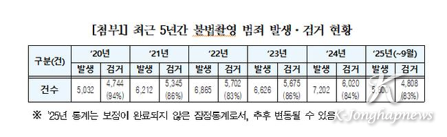 국회 행정안전위원회 신정훈 의원(더불어민주당·전남 나주화순)이 경찰청으로부터 제출받은 자료에 따르면, 2024년 불법촬영 범죄(촬영·유포·소지·구입·시청 등) 발생 건수는 최근 5년간 가장 많았으며, 검거율은 오히려 하락세를 보였다. 2024년 불법촬영 범죄는 7,202건으로 전년 대비 8.7% 증가했지만 검거는 6,020건으로, 2023년 소폭 증가했던 검거율(86%)이 작년 84%로 다시금 하락했다.