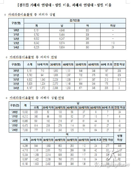 피해자는 88%가 여성으로, 20~30대 여성 피해자가 전체의 65% 이상을 차지했지만 미성년자 피해자 역시 빠른 폭으로 늘고 있다. 20세 이하 여성 피해자는 2020년 944명에서 2024년 1,623명으로 5년 새 72% 가까이 증가했다. 이는 전체 여성 피해자 증가율(45%)보다 훨씬 빠른 속도로, 불법촬영 피해의 최전선에 청소년과 젊은 여성들이 서 있는 현실을 보여준다.