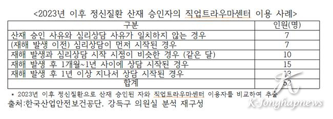 강득구 의원의 요구로 한국산업안전보건공단이 뒤늦게 파악한 결과, 2023년 이후 정신질환으로 산재 승인된 자의 직업트라우마센터 이용 사례는 모두 52건이 확인됐다.