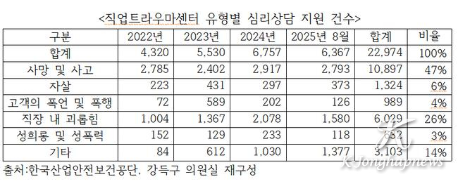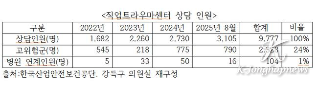 국회 기후에너지환경노동위원회 더불어민주당 강득구 의원(경기 안양만안)이 한국산업안전보건공단으로부터 제출받은 자료에 따르면, 올해 8월까지 직업트라우마센터 심리상담 인원은 3,105명으로 이미 지난해 연간 상담인원 2,730명을 넘어선 것으로 확인됐다. 마찬가지로 상담 결과 고위험군으로 분류된 인원도 올해 들어서만 790명으로 지난해 연간 인원 775명을 넘어섰다.