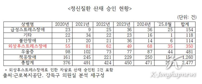 2020년 이후 외상후스트레스장애로 인한 산재 승인 350명, 자살도 2명.