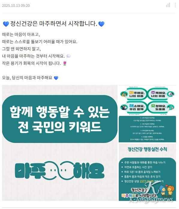 정신건강 인식개선 홍보주간 「마주해요」를 운영했다. 이번 주간은 정신건강 인식 확산과 고위험군 조기 발견을 위한 생활밀착형 활동으로 진행됐다.
