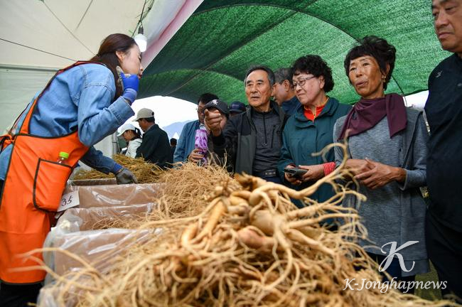 축제장을 방문한 관광객들이 풍기인삼을 구입하고 있다