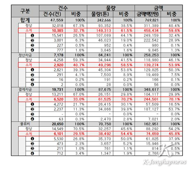 농림축산식품부가 실시한 「정책지원을 받은 업체별 농수산물 온라인도매시장 거래 실태 전수조사(’24~’25.10)」 결과, 조사대상 총 거래규모 7,698억 원 가운데 4,584억 원이 특수관계인 거래, 배송지 인접, 운송정보 미입력 등 ‘허위·이상거래’로 분류됐다. 이는 거래액의 59.6%, 물량의 61.5%에 해당한다.