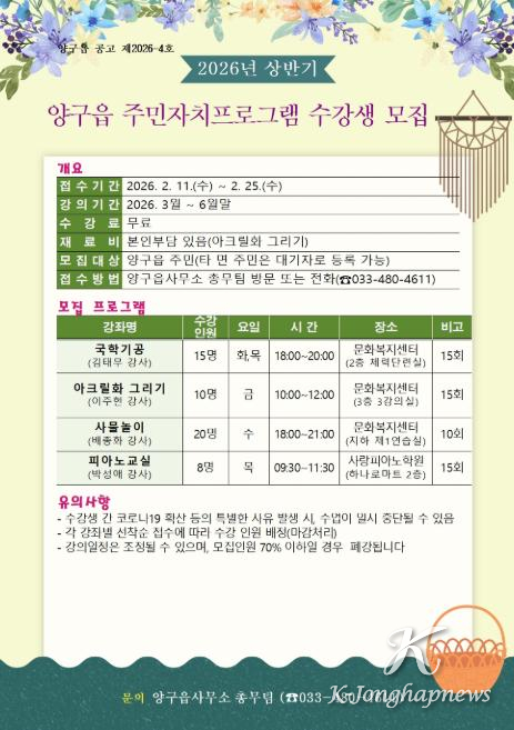 양구읍이 2026년 상반기 주민자치프로그램 수강생을 모집한다.
